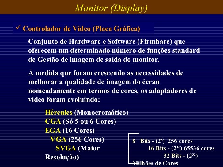 28. 28. Conjunto de Hardware e Software (Firmhare) que oferecem um determinado número de funções standard de Gestão de imagem de saída do monitor. À medida que foram crescendo as necessidades de melhorar a qualidade de imagem do écran nomeadamente em termos de cores, os adaptadores de vídeo foram evoluindo: <ul><li>Controlador de Vídeo (Placa Gráfica) </li></ul>Monitor (Display) Hércules (Monocromático) CGA (Só 5 ou 6 Cores) EGA (16 Cores) VGA (256 Cores) SVGA (Maior Resolução) 8 Bits - (2 8 ) 256 cores 16 Bits - (2 16 ) 65536 cores 32 Bits - (2 32 ) Milhões de Cores
