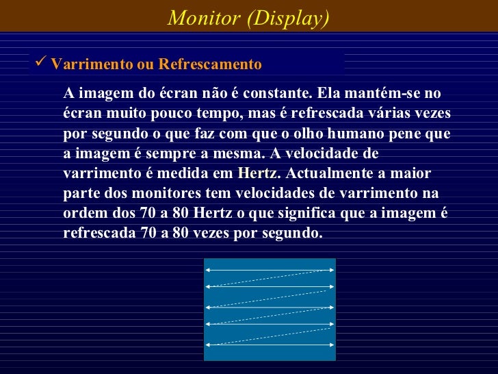 29. 29. A imagem do écran não é constante. Ela mantém-se no écran muito pouco tempo, mas é refrescada várias vezes por segundo o que faz com que o olho humano pene que a imagem é sempre a mesma. A velocidade de varrimento é medida em Hertz . Actualmente a maior parte dos monitores tem velocidades de varrimento na ordem dos 70 a 80 Hertz o que significa que a imagem é refrescada 70 a 80 vezes por segundo. <ul><li>Varrimento ou Refrescamento </li></ul>Monitor (Display)