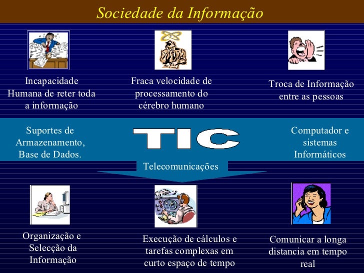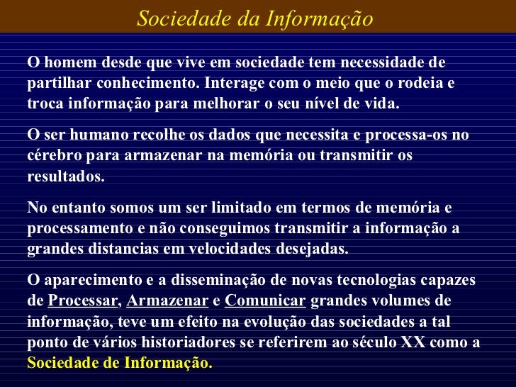 3. 3. Sociedade da Informação O homem desde que vive em sociedade tem necessidade de partilhar conhecimento. Interage com o meio que o rodeia e troca informação para melhorar o seu nível de vida. O ser humano recolhe os dados que necessita e processa-os no cérebro para armazenar na memória ou transmitir os resultados. No entanto somos um ser limitado em termos de memória e processamento e não conseguimos transmitir a informação a grandes distancias em velocidades desejadas. O aparecimento e a disseminação de novas tecnologias capazes de Processar , Armazenar e Comunicar grandes volumes de informação, teve um efeito na evolução das sociedades a tal ponto de vários historiadores se referirem ao século XX como a Sociedade de Informação.