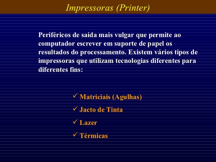 30. 30. Impressoras (Printer) Periféricos de saída mais vulgar que permite ao computador escrever em suporte de papel os resultados do processamento. Existem vários tipos de impressoras que utilizam tecnologias diferentes para diferentes fins: <ul><li>Matriciais (Agulhas) </li></ul><ul><li>Jacto de Tinta </li></ul><ul><li>Lazer </li></ul><ul><li>Térmicas </li></ul>