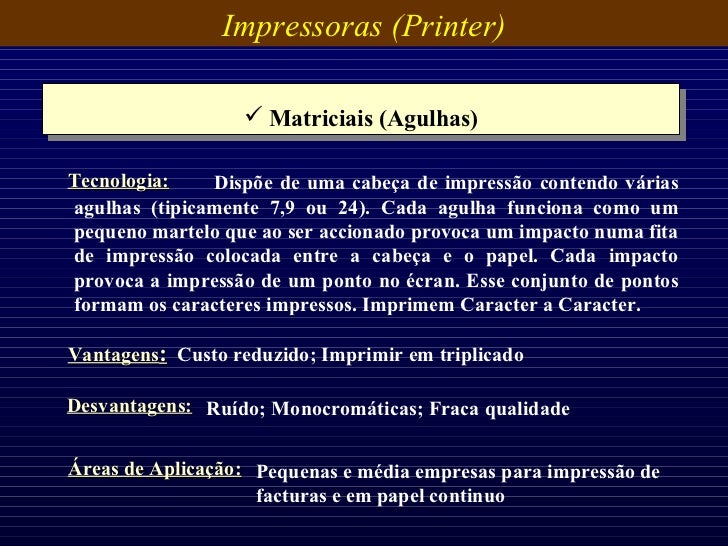 31. 31. Impressoras (Printer) <ul><li>Matriciais (Agulhas) </li></ul>Vantagens : Custo reduzido; Imprimir em triplicado Desvantagens: Ruído; Monocromáticas; Fraca qualidade Áreas de Aplicação: Pequenas e média empresas para impressão de facturas e em papel continuo Dispõe de uma cabeça de impressão contendo várias agulhas (tipicamente 7,9 ou 24). Cada agulha funciona como um pequeno martelo que ao ser accionado provoca um impacto numa fita de impressão colocada entre a cabeça e o papel. Cada impacto provoca a impressão de um ponto no écran. Esse conjunto de pontos formam os caracteres impressos. Imprimem Caracter a Caracter. Tecnologia: