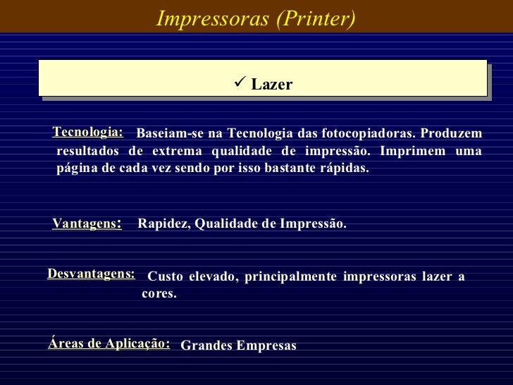 33. 33. Impressoras (Printer) <ul><li>Lazer </li></ul>Vantagens : Rapidez, Qualidade de Impressão. Desvantagens: Custo elevado, principalmente impressoras lazer a cores. Áreas de Aplicação: Grandes Empresas Baseiam-se na Tecnologia das fotocopiadoras. Produzem resultados de extrema qualidade de impressão. Imprimem uma página de cada vez sendo por isso bastante rápidas. Tecnologia: