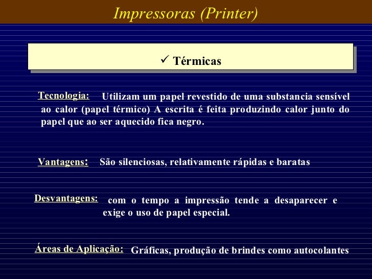 34. 34. Impressoras (Printer) <ul><li>Térmicas </li></ul>Vantagens : São silenciosas, relativamente rápidas e baratas Desvantagens: com o tempo a impressão tende a desaparecer e exige o uso de papel especial. Áreas de Aplicação: Gráficas, produção de brindes como autocolantes Utilizam um papel revestido de uma substancia sensível ao calor (papel térmico) A escrita é feita produzindo calor junto do papel que ao ser aquecido fica negro. Tecnologia: