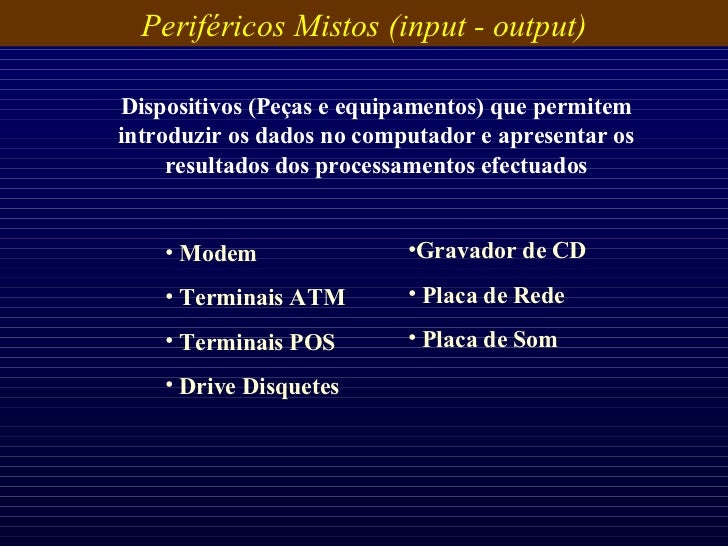 35. 35. Periféricos Mistos (input - output) Dispositivos (Peças e equipamentos) que permitem introduzir os dados no computador e apresentar os resultados dos processamentos efectuados <ul><li>Modem </li></ul><ul><li>Terminais ATM </li></ul><ul><li>Terminais POS </li></ul><ul><li>Drive Disquetes </li></ul><ul><li>Gravador de CD </li></ul><ul><li>Placa de Rede </li></ul><ul><li>Placa de Som </li></ul>