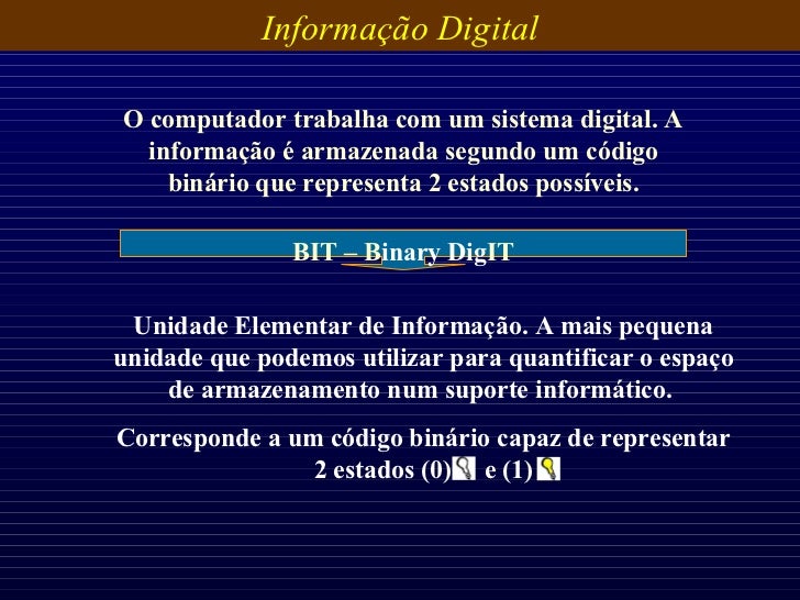 36. 36. Informação Digital BIT – B inary Dig IT Unidade Elementar de Informação. A mais pequena unidade que podemos utilizar para quantificar o espaço de armazenamento num suporte informático. Corresponde a um código binário capaz de representar 2 estados (0) e (1) O computador trabalha com um sistema digital. A informação é armazenada segundo um código binário que representa 2 estados possíveis.