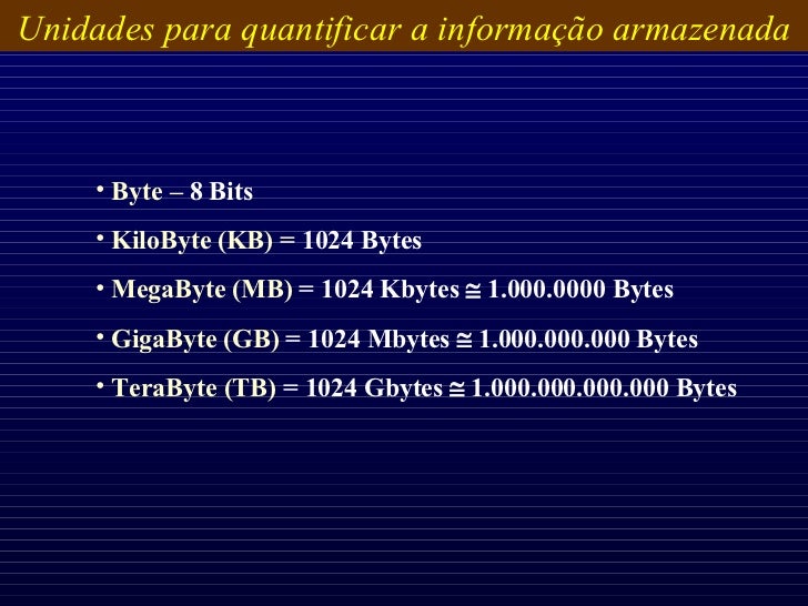 37. 37. Unidades para quantificar a informação armazenada <ul><li>Byte – 8 Bits </li></ul><ul><li>KiloByte (KB) = 1024 Bytes </li></ul><ul><li>MegaByte (MB) = 1024 Kbytes  1.000.0000 Bytes </li></ul><ul><li>GigaByte (GB) = 1024 Mbytes  1.000.000.000 Bytes </li></ul><ul><li>TeraByte (TB) = 1024 Gbytes  1.000.000.000.000 Bytes </li></ul>