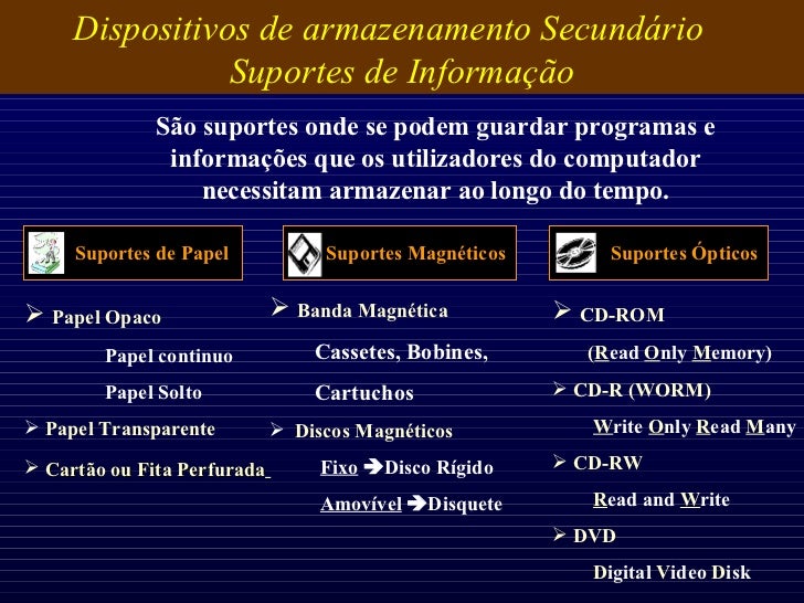 38. 38. Dispositivos de armazenamento Secundário Suportes de Informação São suportes onde se podem guardar programas e informações que os utilizadores do computador necessitam armazenar ao longo do tempo. <ul><li>Papel Opaco </li></ul><ul><li>Papel continuo </li></ul><ul><li>Papel Solto </li></ul><ul><li>Papel Transparente </li></ul><ul><li>Cartão ou Fita Perfurada </li></ul><ul><li>Banda Magnética </li></ul><ul><li>Cassetes, Bobines, </li></ul><ul><li>Cartuchos </li></ul><ul><li>Discos Magnéticos </li></ul><ul><li>Fixo  Disco Rígido </li></ul><ul><li>Amovível  Disquete </li></ul><ul><li>CD-ROM </li></ul><ul><li>( R ead O nly M emory) </li></ul><ul><li>CD-R (WORM) </li></ul><ul><li>W rite O nly R ead M any </li></ul><ul><li>CD-RW </li></ul><ul><li>R ead and W rite </li></ul><ul><li>DVD </li></ul><ul><li>D igital V ideo D isk </li></ul>Suportes de Papel Suportes Magnéticos Suportes Ópticos
