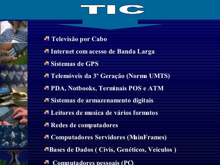 5. 5. <ul><li>Televisão por Cabo </li></ul><ul><li>Internet com acesso de Banda Larga </li></ul><ul><li>Sistemas de GPS </li></ul><ul><li>Telemóveis da 3º Geração (Norma UMTS) </li></ul><ul><li>PDA, Notbooks, Terminais POS e ATM </li></ul><ul><li>Sistemas de armazenamento digitais </li></ul><ul><li>Leitores de musica de vários formatos </li></ul><ul><li>Redes de computadores </li></ul><ul><li>Computadores Servidores (MainFrames) </li></ul><ul><li>Bases de Dados ( Civis, Genéticos, Veículos ) </li></ul><ul><li>Computadores pessoais (PC ) </li></ul>TIC