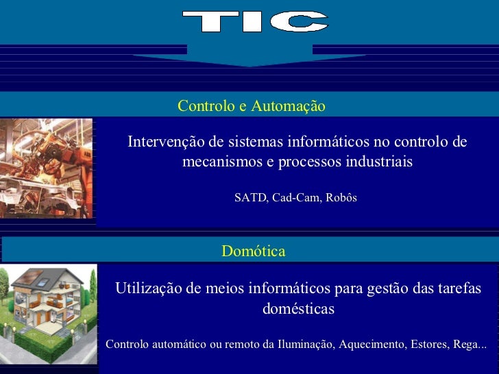 6. 6. Controlo e Automação Domótica TIC Intervenção de sistemas informáticos no controlo de mecanismos e processos industriais SATD, Cad-Cam, Robôs Utilização de meios informáticos para gestão das tarefas domésticas Controlo automático ou remoto da Iluminação, Aquecimento, Estores, Rega...