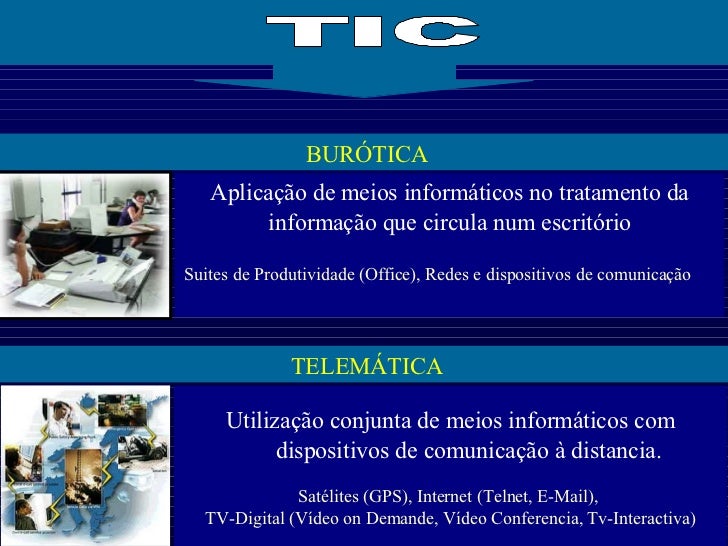 7. 7. BURÓTICA TELEMÁTICA Aplicação de meios informáticos no tratamento da informação que circula num escritório Suites de Produtividade (Office), Redes e dispositivos de comunicação TIC Utilização conjunta de meios informáticos com dispositivos de comunicação à distancia. Satélites (GPS), Internet (Telnet, E-Mail), TV-Digital (Vídeo on Demande, Vídeo Conferencia, Tv-Interactiva)