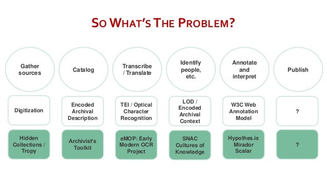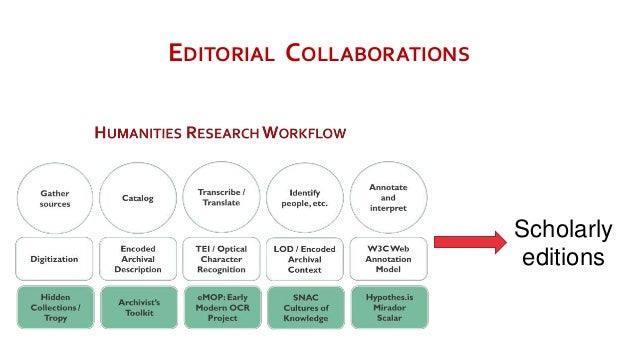 The research workflow as outlined here very closely maps the activities that lead to the production of scholarly editions, with their versions of primary sources and related scholarly apparatus, including explication of named entities and other annotations and arguments.