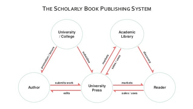 Let’s turn now to the monograph, one of the other major outputs of scholarly research in the humanities. Here is a simplified view of publishing in general, with its major players: the Author, the Publisher, and the Reader. [CLICK] The author submits work to the publisher which edits the work and requests revisions until it is ready to go to market and sell the work to readers.