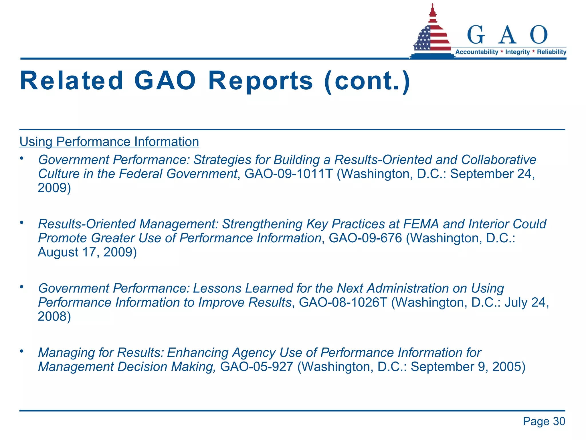 30. 30. Related GAO Reports (cont.) <ul><li>Using Performance Information </li></ul><ul><li>Government Performance: Strategies for Building a Results-Oriented and Collaborative Culture in the Federal Government , GAO-09-1011T (Washington, D.C.: September 24, 2009) </li></ul><ul><li>Results-Oriented Management: Strengthening Key Practices at FEMA and Interior Could Promote Greater Use of Performance Information , GAO-09-676 (Washington, D.C.: August 17, 2009) </li></ul><ul><li>Government Performance: Lessons Learned for the Next Administration on Using Performance Information to Improve Results , GAO-08-1026T (Washington, D.C.: July 24, 2008) </li></ul><ul><li>Managing for Results: Enhancing Agency Use of Performance Information for Management Decision Making, GAO-05-927 (Washington, D.C.: September 9, 2005) </li></ul>Page