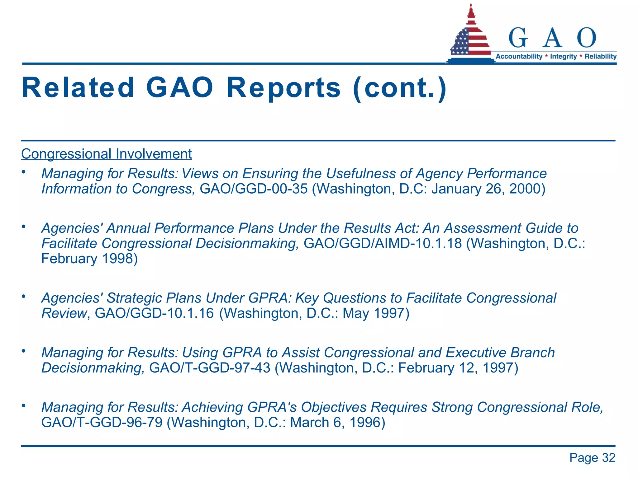 32. 32. Related GAO Reports (cont.) <ul><li>Congressional Involvement </li></ul><ul><li>Managing for Results: Views on Ensuring the Usefulness of Agency Performance Information to Congress, GAO/GGD-00-35 (Washington, D.C: January 26, 2000) </li></ul><ul><li>Agencies' Annual Performance Plans Under the Results Act: An Assessment Guide to Facilitate Congressional Decisionmaking, GAO/GGD/AIMD-10.1.18 (Washington, D.C.: February 1998) </li></ul><ul><li>Agencies' Strategic Plans Under GPRA: Key Questions to Facilitate Congressional Review , GAO/GGD-10.1.16 (Washington, D.C.: May 1997) </li></ul><ul><li>Managing for Results: Using GPRA to Assist Congressional and Executive Branch Decisionmaking, GAO/T-GGD-97-43 (Washington, D.C.: February 12, 1997) </li></ul><ul><li>Managing for Results: Achieving GPRA's Objectives Requires Strong Congressional Role, GAO/T-GGD-96-79 (Washington, D.C.: March 6, 1996) </li></ul>Page