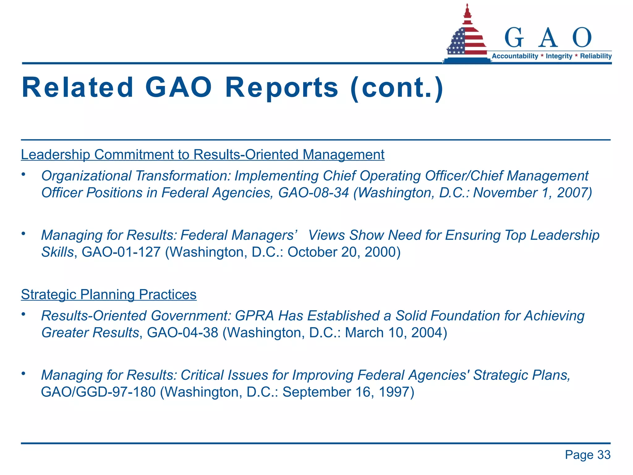 33. 33. Related GAO Reports (cont.) <ul><li>Leadership Commitment to Results-Oriented Management </li></ul><ul><li>Organizational Transformation: Implementing Chief Operating Officer/Chief Management Officer Positions in Federal Agencies, GAO-08-34 (Washington, D.C.: November 1, 2007) </li></ul><ul><li>Managing for Results: Federal Managers’ Views Show Need for Ensuring Top Leadership Skills , GAO-01-127 (Washington, D.C.: October 20, 2000) </li></ul><ul><li>Strategic Planning Practices </li></ul><ul><li>Results-Oriented Government: GPRA Has Established a Solid Foundation for Achieving Greater Results , GAO-04-38 (Washington, D.C.: March 10, 2004) </li></ul><ul><li>Managing for Results: Critical Issues for Improving Federal Agencies' Strategic Plans, GAO/GGD-97-180 (Washington, D.C.: September 16, 1997) </li></ul>Page