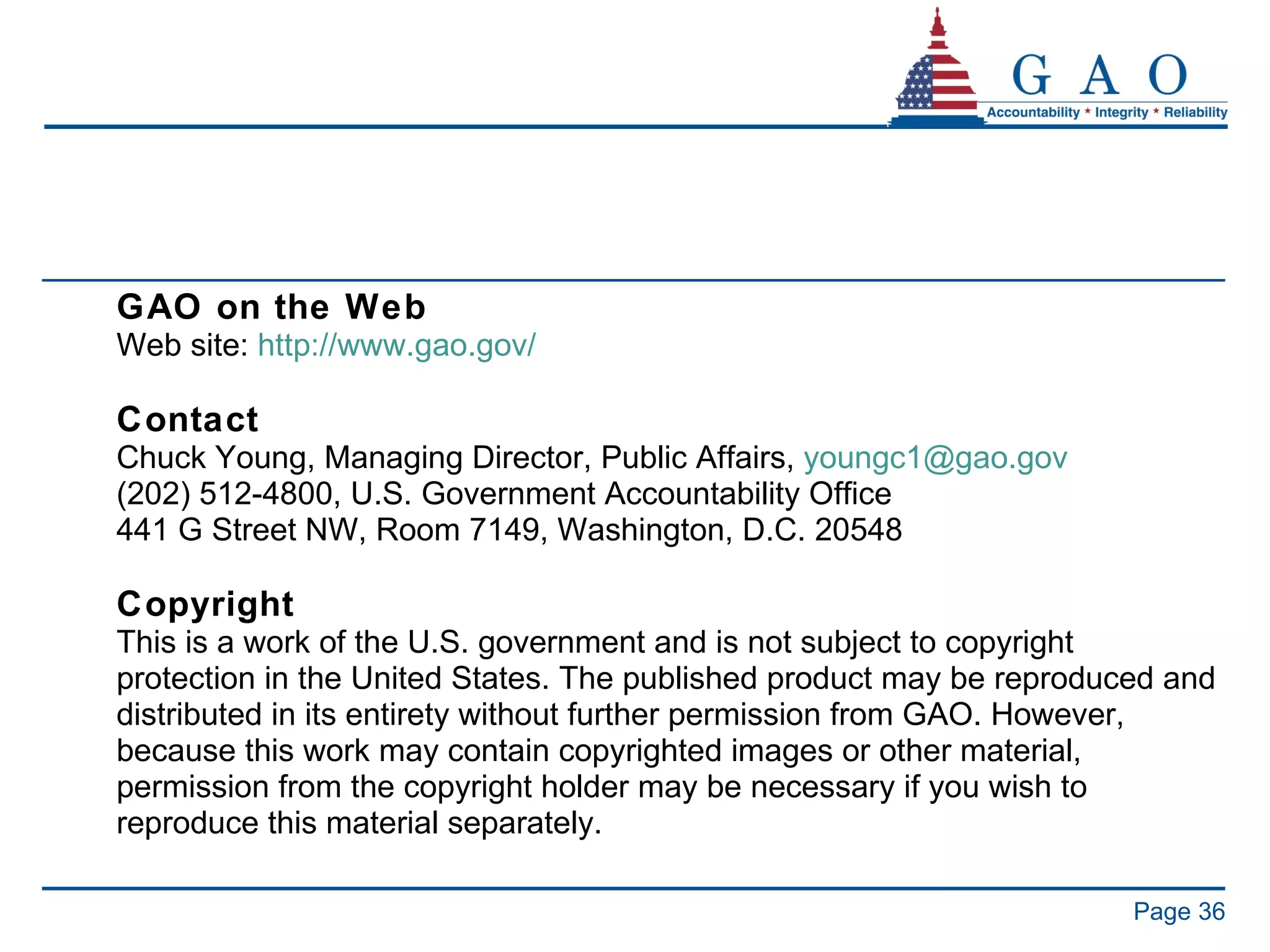 36. 36. Page GAO on the Web Web site: http:// www.gao.gov /   Contact Chuck Young, Managing Director, Public Affairs, [email_address] (202) 512-4800, U.S. Government Accountability Office 441 G Street NW, Room 7149, Washington, D.C. 20548 Copyright This is a work of the U.S. government and is not subject to copyright protection in the United States. The published product may be reproduced and distributed in its entirety without further permission from GAO. However, because this work may contain copyrighted images or other material, permission from the copyright holder may be necessary if you wish to reproduce this material separately.