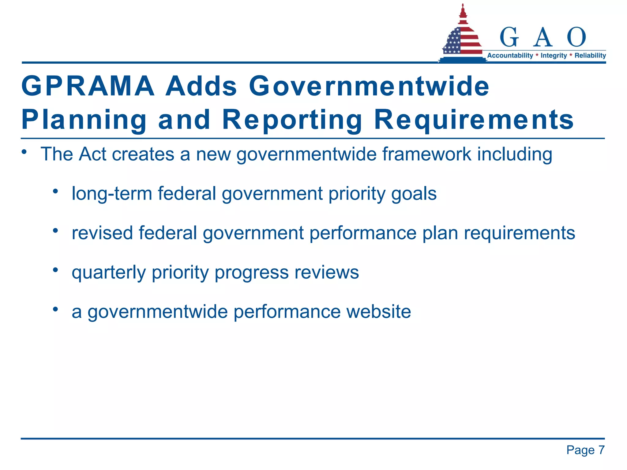 7. 7. GPRAMA Adds Governmentwide Planning and Reporting Requirements <ul><li>The Act creates a new governmentwide framework including </li></ul><ul><ul><li>long-term federal government priority goals </li></ul></ul><ul><ul><li>revised federal government performance plan requirements </li></ul></ul><ul><ul><li>quarterly priority progress reviews </li></ul></ul><ul><ul><li>a governmentwide performance website </li></ul></ul>Page