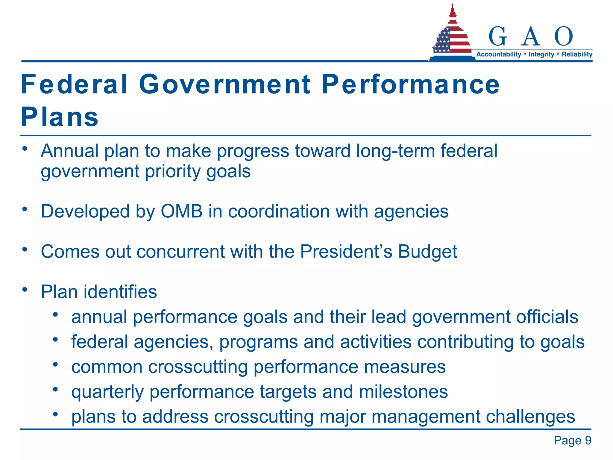 9. 9. Federal Government Performance Plans <ul><li>Annual plan to make progress toward long-term federal government priority goals </li></ul><ul><li>Developed by OMB in coordination with agencies </li></ul><ul><li>Comes out concurrent with the President’s Budget </li></ul><ul><li>Plan identifies </li></ul><ul><ul><li>annual performance goals and their lead government officials </li></ul></ul><ul><ul><li>federal agencies, programs and activities contributing to goals </li></ul></ul><ul><ul><li>common crosscutting performance measures </li></ul></ul><ul><ul><li>quarterly performance targets and milestones </li></ul></ul><ul><ul><li>plans to address crosscutting major management challenges </li></ul></ul>Page