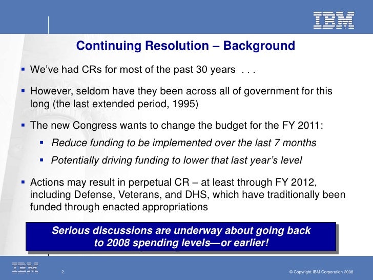 3. 3. Continuing Resolution – Background  CRs fund programs, whose appropriations have expired and new funding has not been authorized for the new fiscal year  Nearly all salaries and expenses of federal departments and agencies are supported by this kind of appropriation  CRs normally authorize departments and agencies to keep funding their programs at the level of the previous year's appropriations  For Fiscal 2011, an initial CR was enacted to cover government through early December 2010.  Before adjournment of the 111th Congress in December, however, another CR (PL 111-322) was enacted to continue government operations through March 4, 2011 3 © Copyright IBM Corporation 2008