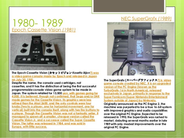 2. 2. NEC SuperGrafx (1989)1980- 1989(1981)Epoch Cassette VisionThe Epoch Cassette Vision (カセットビジョン Kasetto Bijon?) wasa video game console made by Epoch and released in Japanon July 30, 1981. The SuperGrafx (スーパーグラフィックス?) is videoDespite the name, the console used cartridges, not game console created by NEC. It is an upgradedcassettes, and it has the distinction of being the first successful version of the PC Engine (known as theprogrammable console video game system to be made in TurboGrafx-16 in North America), releasedJapan. The system retailed for 13,500 yen, with games going for exclusively in Japan, primarily in response to the4,000. It is believed, though not confirmed, that Sega and/or SNK Super Famicom (Super Nintendo Entertainmentmade games for the Cassette Vision. Its graphics were less System outside of Japan) by Nintendo.refined than the Atari 2600, and the only controls were four Originally announced as the PC Engine 2, theknobs (two to a player, one for horizontal movement, one for machine was purported to be a true 16-bit systemvertical) built into the console itself, along with two fire buttons to with improved graphics and audio capabilitiesa player. Though the Cassette Vision was not a fantastic seller, it over the original PC Engine. Expected to bemanaged to spawn off a smaller, cheaper version called the released in 1990, the SuperGrafx was rushed toCassette Vision Jr. and a successor called the Super Cassette market, debuting several months earlier in lateVision. The latter was released in 1984, and was sold in 1989 with only modest improvements over theEurope, with little success. original PC Engine.