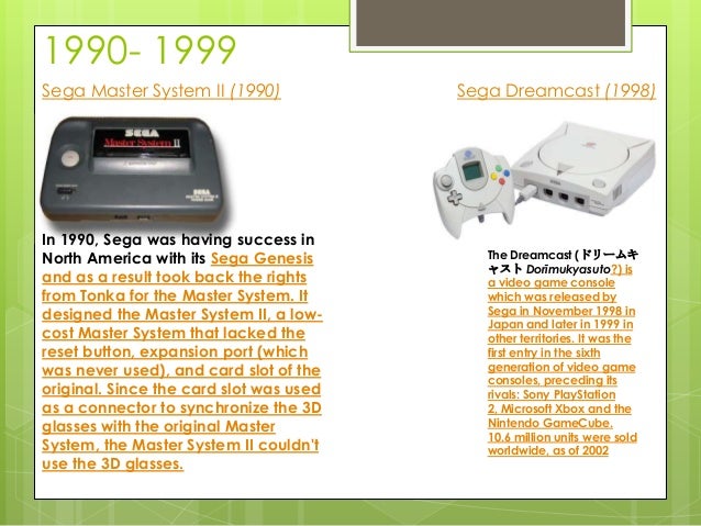 3. 3. 1990- 1999Sega Master System II (1990) Sega Dreamcast (1998)In 1990, Sega was having success inNorth America with its Sega Genesis The Dreamcast (ドリームキ ャスト Dorīmukyasuto?) isand as a result took back the rights a video game consolefrom Tonka for the Master System. It which was released bydesigned the Master System II, a low- Sega in November 1998 in Japan and later in 1999 incost Master System that lacked the other territories. It was thereset button, expansion port (which first entry in the sixthwas never used), and card slot of the generation of video game consoles, preceding itsoriginal. Since the card slot was used rivals: Sony PlayStationas a connector to synchronize the 3D 2, Microsoft Xbox and theglasses with the original Master Nintendo GameCube. 10.6 million units were soldSystem, the Master System II couldnt worldwide, as of 2002use the 3D glasses.