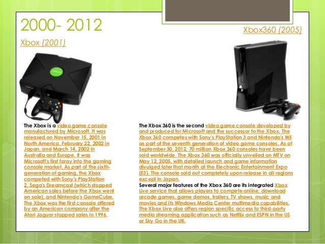 4. 4. 2000- 2012 Xbox360 (2005)Xbox (2001)The Xbox is a video game console The Xbox 360 is the second video game console developed bymanufactured by Microsoft. It was and produced for Microsoft and the successor to the Xbox. Thereleased on November 15, 2001 in Xbox 360 competes with Sonys PlayStation 3 and Nintendos WiiNorth America, February 22, 2002 in as part of the seventh generation of video game consoles. As ofJapan, and March 14, 2002 in September 30, 2012, 70 million Xbox 360 consoles have beenAustralia and Europe. It was sold worldwide. The Xbox 360 was officially unveiled on MTV onMicrosofts first foray into the gaming May 12, 2005, with detailed launch and game informationconsole market. As part of the sixth- divulged later that month at the Electronic Entertainment Expogeneration of gaming, the Xbox (E3). The console sold out completely upon release in all regionscompeted with Sonys PlayStation except in Japan.2, Segas Dreamcast (which stopped Several major features of the Xbox 360 are its integrated XboxAmerican sales before the Xbox went Live service that allows players to compete online, downloadon sale), and Nintendos GameCube. arcade games, game demos, trailers, TV shows, music andThe Xbox was the first console offered movies and its Windows Media Center multimedia capabilities.by an American company after the The Xbox Live also offers region specific access to third-partyAtari Jaguar stopped sales in 1996. media streaming application such as Netflix and ESPN in the US or Sky Go in the UK.
