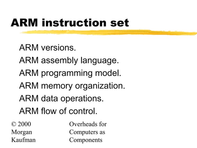 10. 10. Address Opcode Mnemonic Operands 00000000 E0804001 ADD R4,R0,R1 1. Branch instructions 2. Register Load and Store instructions 3. Data processing instructions 4. Coprocessor instructions 5. Status register access instructions