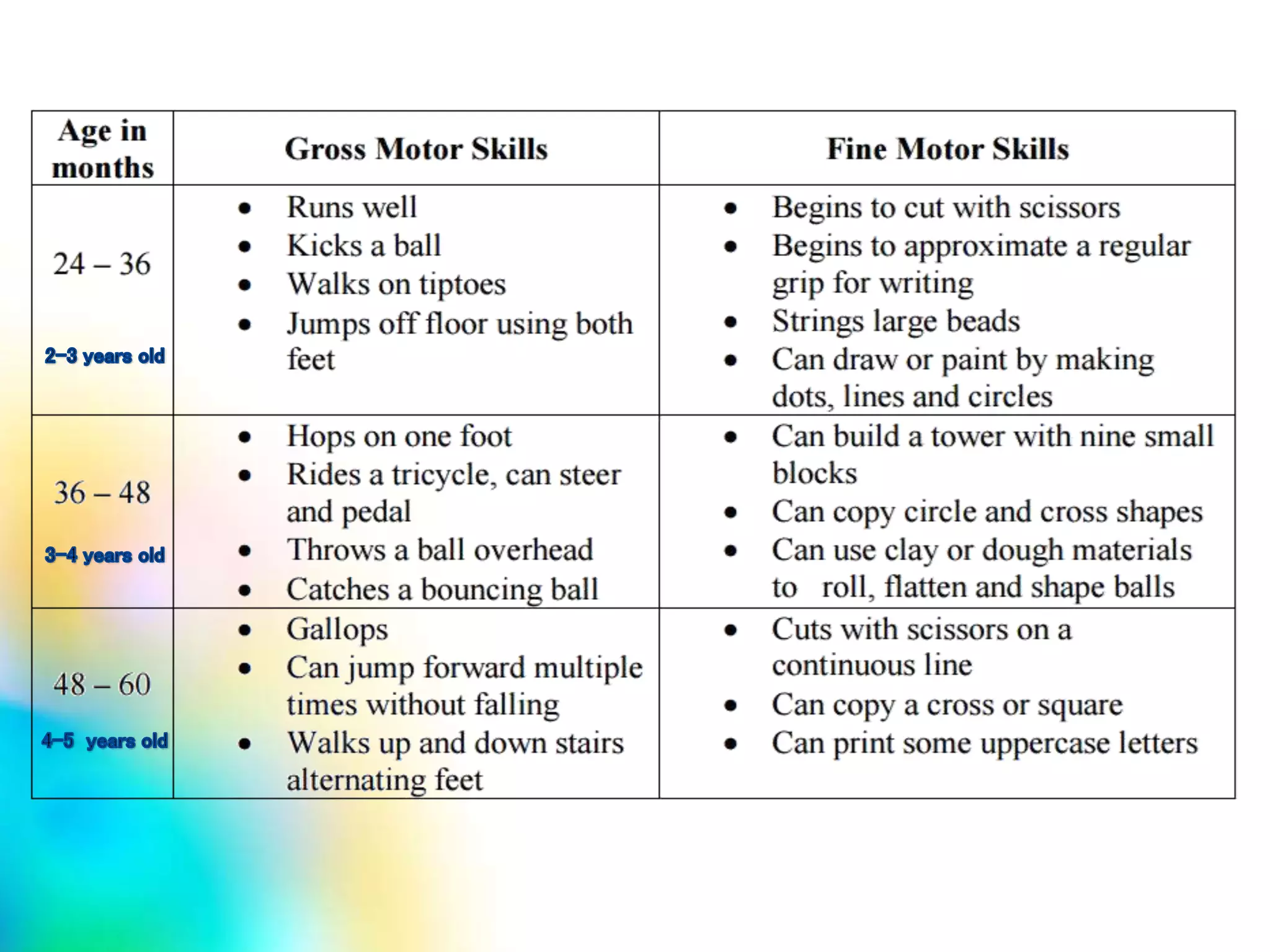 Fine motor skills involve smaller muscle movements like those in the hands and wrists, while gross motor skills use larger muscle groups for actions such as walking, running, and jumping. Motor development progresses through stages from infanthood to age 2, starting with newborn reflexes. To promote overall motor skill growth, children should be provided daily opportunities for large muscle exercise, small motor activities, and child-sized materials in adequate quantities allowing all to participate. Cultural differences should also be considered regarding motor development milestones.