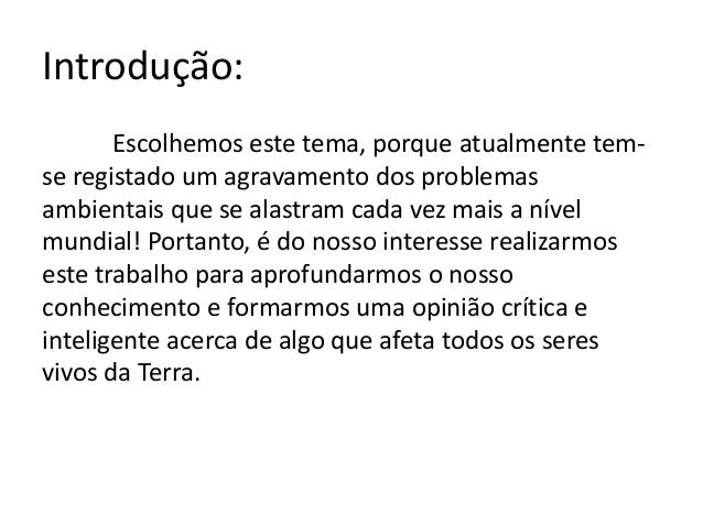 Introdução:Escolhemos este tema, porque atualmente tem-se registado um agravamento dos problemasambientais que se alastram...