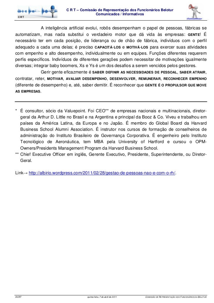 2. 2. C R T – Comissão de Representação dos Funcionários Belotur Comunicados / Informativos A inteligência artificial evolui, robôs desempenham o papel de pessoas, fábricas seautomatizam, mas nada substitui o verdadeiro motor que dá vida às empresas: GENTE! Énecessário ter em cada posição, de liderança ou de chão de fábrica, indivíduos com o perfiladequado a cada uma delas; é preciso CAPACITÁ-LOS e MOTIVÁ-LOS para exercer suas atividadescom empenho e alto desempenho, individualmente ou em equipes. Funções diferentes requeremperfis específicos. Indivíduos de diferentes gerações podem necessitar de motivações igualmentediversas; integrar baby boomers, Xs e Ys é um dos desafios a serem vencidos pelos gestores. Gerir gente eficazmente é SABER DEFINIR AS NECESSIDADES DE PESSOAL, SABER ATRAIR,contratar, reter, MOTIVAR, AVALIAR DESEMPENHO, DESENVOLVER, REMUNERAR, RECONHECER EMPENHO(diferente de desempenho) e, até, saber demitir. É reconhecer que GENTE É O PROPULSOR QUE MOVEAS EMPRESAS.* É consultor, sócio da Valuepoint. Foi CEO** de empresas nacionais e multinacionais, diretor- geral da Arthur D. Little no Brasil e na Argentina e principal da Booz & Co. Viveu e trabalhou em países da América Latina, da Europa e no Japão. É membro do Global Board da Harvard Business School Alumni Association. É instrutor nos cursos de formação de conselheiros de administração do Instituto Brasileiro de Governança Corporativa. É engenheiro pelo Instituto Tecnológico de Aeronáutica, tem MBA pela University of Hartford e cursou o OPM- Owners/Presidents Management Program da Harvard Business School.** Chief Executive Officer em inglês, Gerente Executivo, Presidente, Superintendente, ou Diretor- Geral.Link→ http://albirio.wordpress.com/2011/02/28/gestao-de-pessoas-nao-e-com-o-rh/.©CRT quinta-feira, 7 de abril de 2011 COMISSÃO DE REPRESENTAÇÃO DOS FUNCIONÁRIOS DA BELOTUR