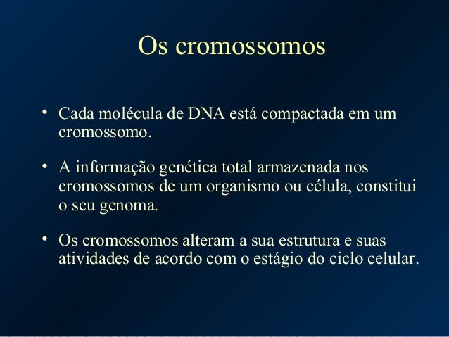 10. 10. Os cromossomos • Cada molécula de DNA está compactada em um cromossomo. • A informação genética total armazenada nos cromossomos de um organismo ou célula, constitui o seu genoma. • Os cromossomos alteram a sua estrutura e suas atividades de acordo com o estágio do ciclo celular.