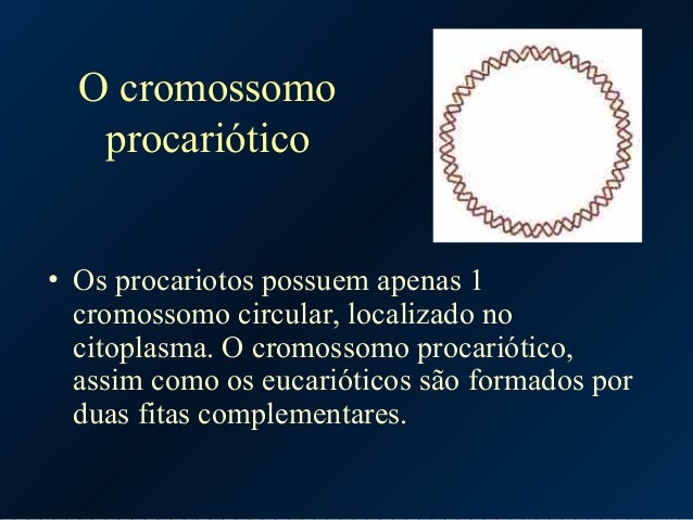 11. 11. O cromossomo procariótico • Os procariotos possuem apenas 1 cromossomo circular, localizado no citoplasma. O cromossomo procariótico, assim como os eucarióticos são formados por duas fitas complementares.