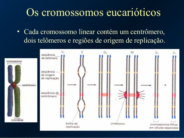12. 12. Os cromossomos eucarióticos • Cada cromossomo linear contém um centrômero, dois telômeros e regiões de origem de replicação.