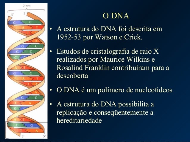 4. 4. O DNA • A estrutura do DNA foi descrita em 1952-53 por Watson e Crick. • Estudos de cristalografia de raio X realizados por Maurice Wilkins e Rosalind Franklin contribuíram para a descoberta • O DNA é um polímero de nucleotídeos • A estrutura do DNA possibilita a replicação e conseqüentemente a hereditariedade