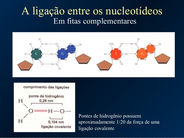 7. 7. A ligação entre os nucleotídeos Em fitas complementares Pontes de hidrogênio possuem aproximadamente 1/20 da força de uma ligação covalente