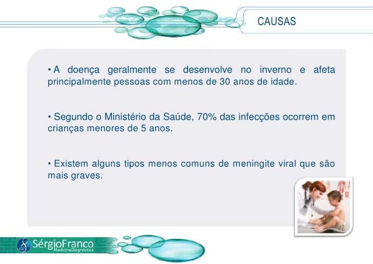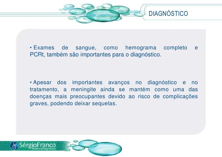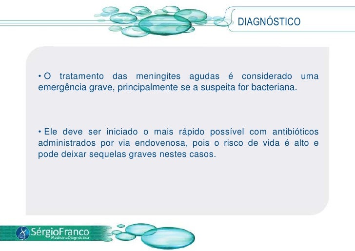11. 11. Apesar dos importantes avanços no diagnóstico e no tratamento, a meningite ainda se mantém como uma das doenças mais preocupantes devido ao risco de complicações graves, podendo deixar sequelas.</li></li></ul><li>TRATAMENTO<br /><ul><li> Procurar um médico aos primeiros sinais da doença é fundamental para a indicação do melhor tratamento para cada caso.