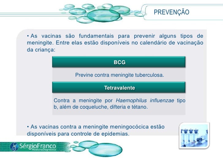15. 15. As vacinas contra a meningite meningocócica estão disponíveis para controle de epidemias.</li></ul>BCG<br />Previne contra meningite tuberculosa.<br />Tetravalente <br />Contra a meningite por Haemophilusinfluenzaetipo b, além de coqueluche, difteria e tétano. <br />