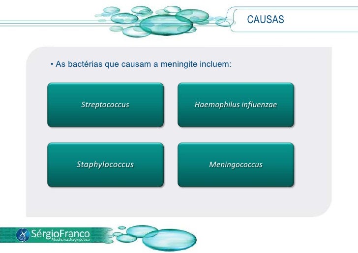 3. 3. No Brasil, qualquer forma de meningite é doença de notificação compulsória, ou seja, cada vez que um médico faz o diagnóstico de meningite ele é obrigado a notificar. É desta forma que pode se identificar uma epidemia de meningite.</li></li></ul><li>CAUSAS<br /><ul><li>As bactérias que causam a meningite incluem: </li></li></ul><li>CAUSAS<br />Meningite bacteriana aguda<br />É uma doença muito grave e deve ser tratada imediatamente para prevenir danos permanentes.<br />Meningite viral<br />É menos grave e mais frequente do que a bacteriana.<br />