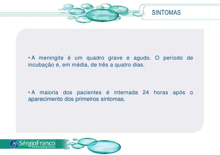 6. 6. Existem alguns tipos menos comuns de meningite viral que são mais graves.</li></li></ul><li>SINTOMAS<br /><ul><li> A meningite é um quadro grave e agudo. O período de incubação é, em média, de três a quatro dias.