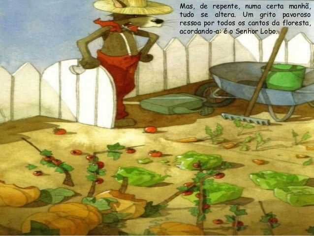 7. 7. O Senhor Lobo fica maravilhado quando os tomates e os pimentos começam a amadurecer, quando as ervilhas e os feijões crescem ao longo das estacas e as gordas abóboras amarelecem, como bolas douradas.