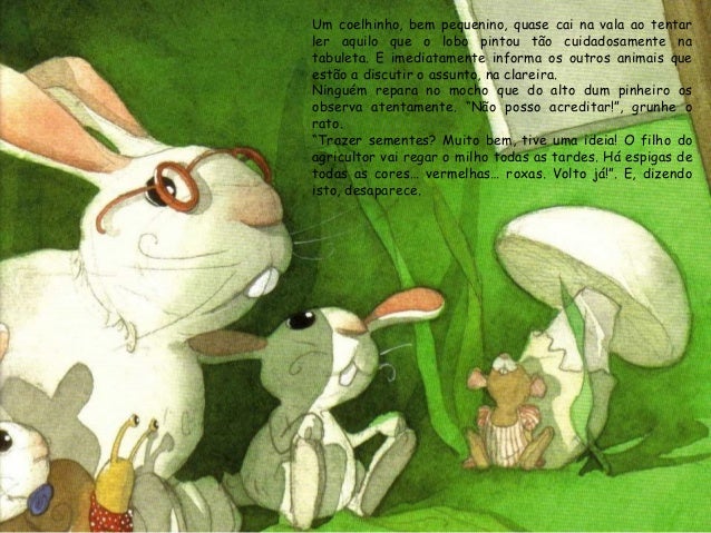 14. 14. Um coelhinho, bem pequenino, quase cai na vala ao tentar ler aquilo que o lobo pintou tão cuidadosamente na tabuleta. E imediatamente informa os outros animais que estão a discutir o assunto, na clareira. Ninguém repara no mocho que do alto dum pinheiro os observa atentamente. “Não posso acreditar!”, grunhe o rato. “Trazer sementes? Muito bem, tive uma ideia! O filho do agricultor vai regar o milho todas as tardes. Há espigas de todas as cores… vermelhas… roxas. Volto já!”. E, dizendo isto, desaparece.