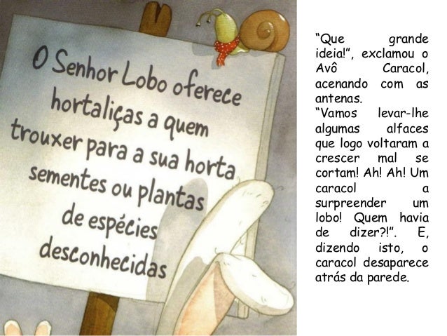 15. 15. “Que grande ideia!”, exclamou o Avô Caracol, acenando com as antenas. “Vamos levar-lhe algumas alfaces que logo voltaram a crescer mal se cortam! Ah! Ah! Um caracol a surpreender um lobo! Quem havia de dizer?!”. E, dizendo isto, o caracol desaparece atrás da parede.