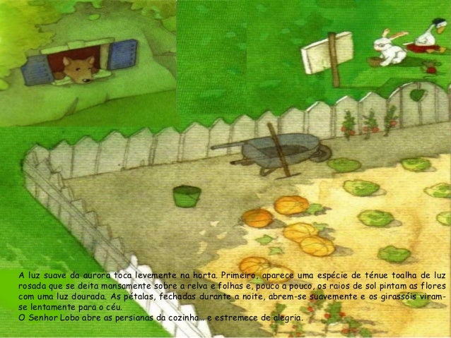 16. 16. A luz suave da aurora toca levemente na horta. Primeiro, aparece uma espécie de ténue toalha de luz rosada que se deita mansamente sobre a relva e folhas e, pouco a pouco, os raios de sol pintam as flores com uma luz dourada. As pétalas, fechadas durante a noite, abrem-se suavemente e os girassóis viram-se lentamente para o céu. O Senhor Lobo abre as persianas da cozinha… e estremece de alegria.