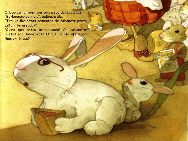 18. 18. O lobo cumprimenta-a com a sua delicada voz. “Bo-boomm-bom dia”, balbucia ela. “Trouxe-lhe estas sementes de rabanete preto. Está interessado?” “Claro que estou interessado! Os rabanetes pretos são saborosos? O que hei-de oferecer-lhes em troca?”