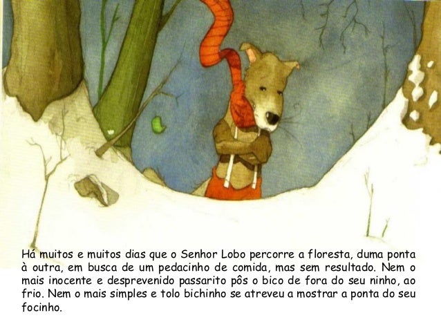 2. 2. Há muitos e muitos dias que o Senhor Lobo percorre a floresta, duma ponta à outra, em busca de um pedacinho de comida, mas sem resultado. Nem o mais inocente e desprevenido passarito pôs o bico de fora do seu ninho, ao frio. Nem o mais simples e tolo bichinho se atreveu a mostrar a ponta do seu focinho.