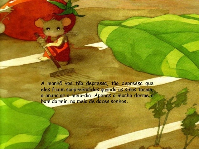 22. 22. A manhã voa tão depressa, tão depressa que eles ficam surpreendidos quando os sinos tocam, a anunciar o meio-dia. Apenas o mocho dorme a bom dormir, no meio de doces sonhos.