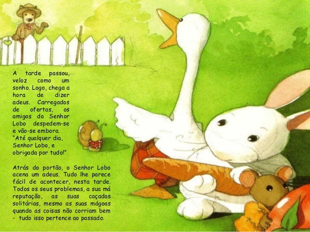 24. 24. A tarde passou, veloz como um sonho. Logo, chega a hora de dizer adeus. Carregados de ofertas, os amigos do Senhor Lobo despedem-se e vão-se embora. “Até qualquer dia, Senhor Lobo, e obrigada por tudo!” Atrás do portão, o Senhor Lobo acena um adeus. Tudo lhe parece fácil de acontecer, nesta tarde. Todos os seus problemas, a sua má reputação, as suas caçadas solitárias, mesmo as suas mágoas quando as coisas não corriam bem - tudo isso pertence ao passado.