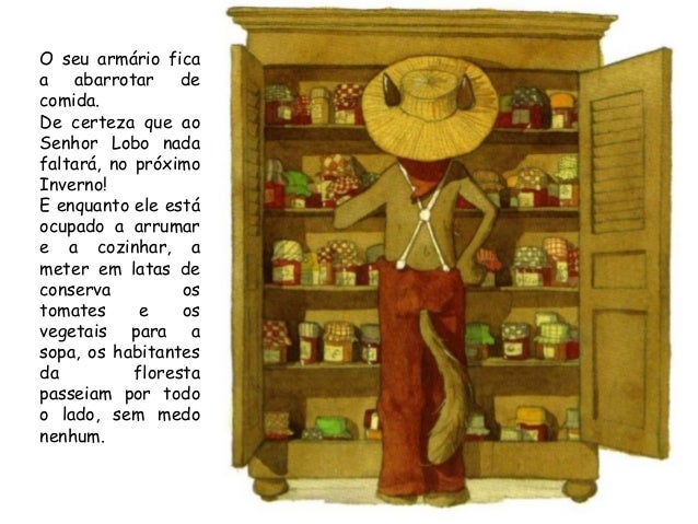 8. 8. O seu armário fica a abarrotar de comida. De certeza que ao Senhor Lobo nada faltará, no próximo Inverno! E enquanto ele está ocupado a arrumar e a cozinhar, a meter em latas de conserva os tomates e os vegetais para a sopa, os habitantes da floresta passeiam por todo o lado, sem medo nenhum.