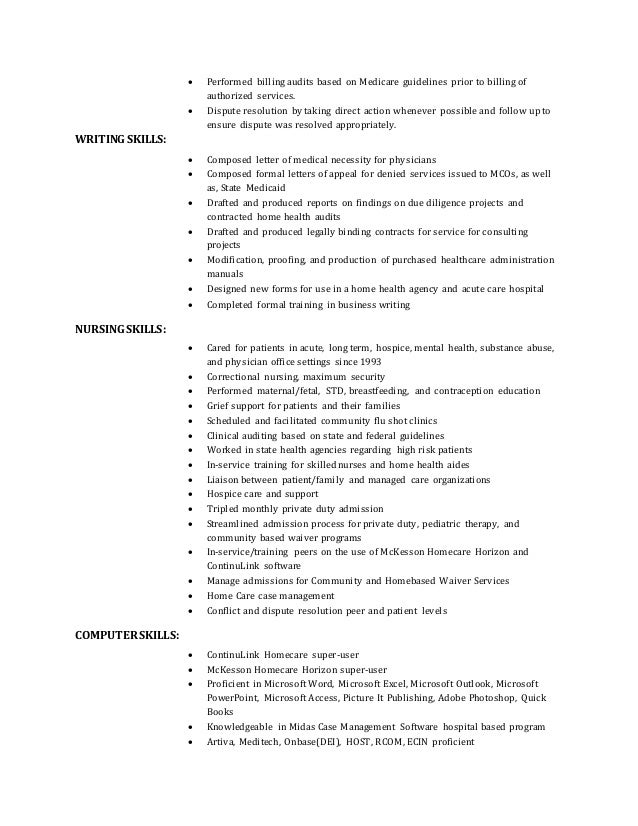 2. 2.  Performed billing audits based on Medicare guidelines prior to billing of authorized services.  Dispute resolution by taking direct action whenever possible and follow up to ensure dispute was resolved appropriately. WRITING SKILLS:  Composed letter of medical necessity for physicians  Composed formal letters of appeal for denied services issued to MCOs, as well as, State Medicaid  Drafted and produced reports on findings on due diligence projects and contracted home health audits  Drafted and produced legally binding contracts for service for consulting projects  Modification, proofing, and production of purchased healthcare administration manuals  Designed new forms for use in a home health agency and acute care hospital  Completed formal training in business writing NURSING SKILLS:  Cared for patients in acute, long term, hospice, mental health, substance abuse, and physician office settings since 1993  Correctional nursing, maximum security  Performed maternal/fetal, STD, breastfeeding, and contraception education  Grief support for patients and their families  Scheduled and facilitated community flu shot clinics  Clinical auditing based on state and federal guidelines  Worked in state health agencies regarding high risk patients  In-service training for skillednurses and home health aides  Liaison between patient/family and managed care organizations  Hospice care and support  Tripled monthly private duty admission  Streamlined admission process for private duty, pediatric therapy, and community based waiver programs  In-service/training peers on the use of McKesson Homecare Horizon and ContinuLink software  Manage admissions for Community and Homebased Waiver Services  Home Care case management  Conflict and dispute resolution peer and patient levels COMPUTERSKILLS:  ContinuLink Homecare super-user  McKesson Homecare Horizon super-user  Proficient in Microsoft Word, Microsoft Excel, Microsoft Outlook, Microsoft PowerPoint, Microsoft Access, Picture It Publishing, Adobe Photoshop, Quick Books  Knowledgeable in Midas Case Management Software hospital based program  Artiva, Meditech, Onbase(DEI), HOST, RCOM, ECIN proficient