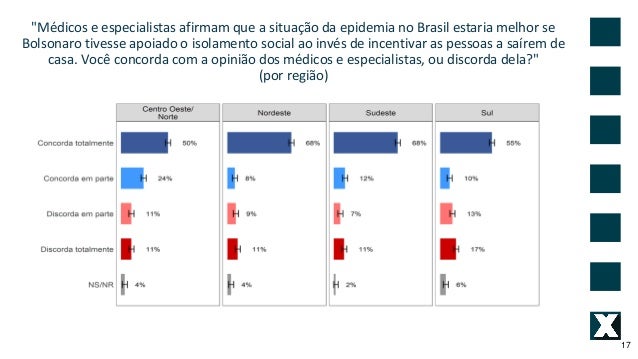 17. 17. "M�dicos e especialistas afirmam que a situa��o da epidemia no Brasil estaria melhor se Bolsonaro tivesse apoiado o isolamento social ao inv�s de incentivar as pessoas a sa�rem de casa. Voc� concorda com a opini�o dos m�dicos e especialistas, ou discorda dela?" (por regi�o) 17
